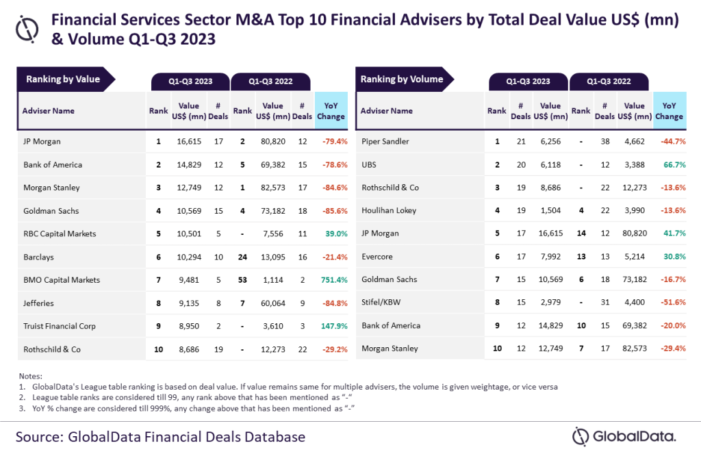 JP Morgan, Piper Sandler top financial services M&A advisers in Q1-Q3 2023