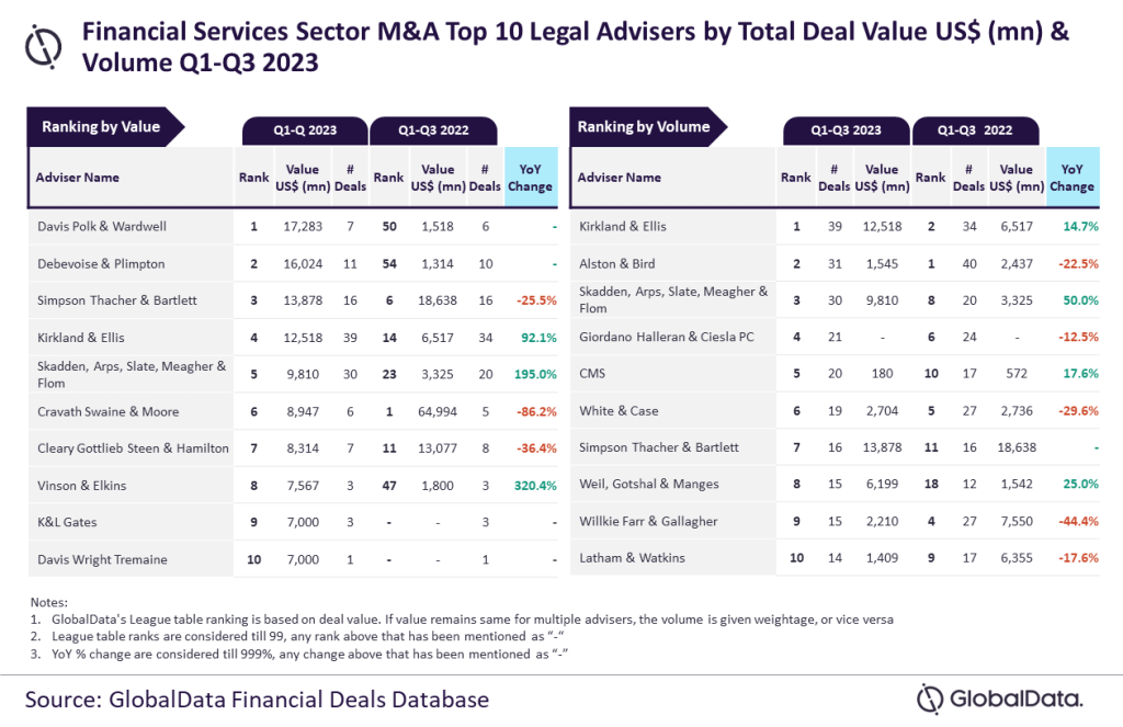 Davis Polk & Wardwell, Kirkland & Ellis lead financial services-sector M&A legal advisers in Q1-Q3 2023